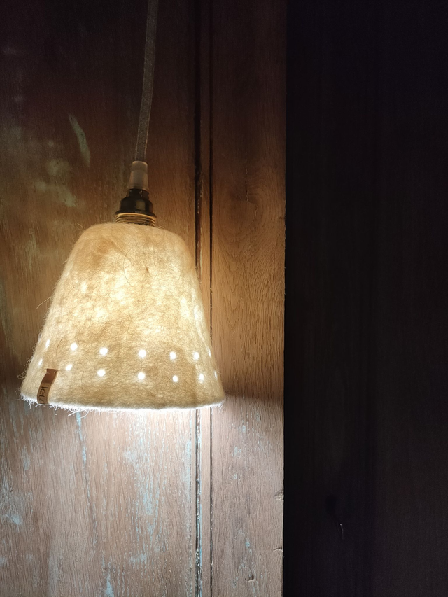 Entretien: la laine est naturellement antistatique et n'attire pas la poussière, elle s'auto-nettoie. Si vraiment votre abat-jour en a besoin, il suffit de le brosser ou de l'aspirer doucement. En cas de tâche utiliser une éponge humide et du savon en frottant délicatement.